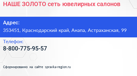 НАШЕ ЗОЛОТО, сеть ювелирных салонов по адресу 353451, Краснодарский край, Анапа, Астраханская, 99 в дальнейшем Организация, размещена в следующих категориях: