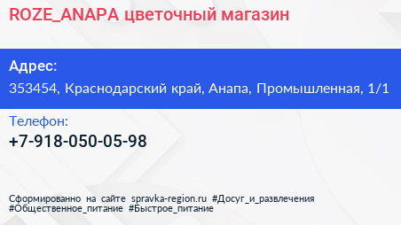 @ROZE_ANAPA, цветочный магазин по адресу 353454, Краснодарский край, Анапа, Промышленная, 1/1 в дальнейшем Организация, размещена в следующих категориях: