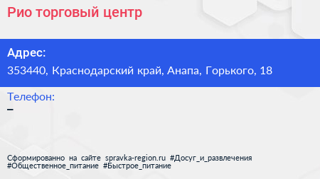 Рио, торговый центр по адресу 353440, Краснодарский край, Анапа, Горького, 18 в дальнейшем Организация, размещена в следующих категориях: