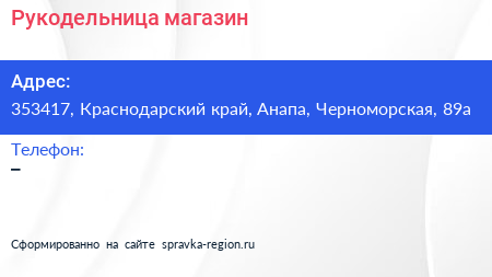 Рукодельница, магазин по адресу 353417, Краснодарский край, Анапа, Черноморская, 89а в дальнейшем Организация, размещена в следующих категориях:
