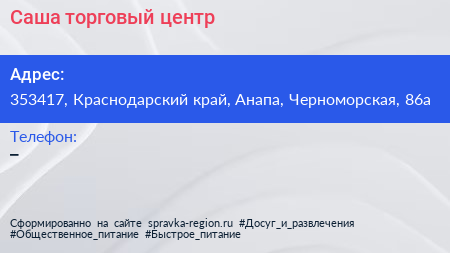 Саша, торговый центр по адресу 353417, Краснодарский край, Анапа, Черноморская, 86а в дальнейшем Организация, размещена в следующих категориях: