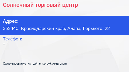 Солнечный, торговый центр по адресу 353440, Краснодарский край, Анапа, Горького, 22 в дальнейшем Организация, размещена в следующих категориях: