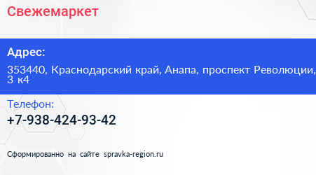 Свежемаркет по адресу 353440, Краснодарский край, Анапа, проспект Революции, 3 к4 в дальнейшем Организация, размещена в следующих категориях:
