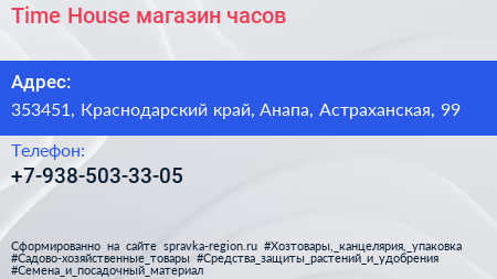 Time House, магазин часов по адресу 353451, Краснодарский край, Анапа, Астраханская, 99 в дальнейшем Организация, размещена в следующих категориях: