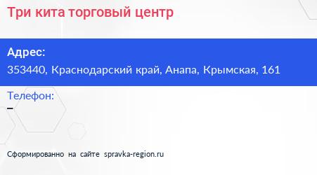 Три кита, торговый центр по адресу 353440, Краснодарский край, Анапа, Крымская, 161 в дальнейшем Организация, размещена в следующих категориях: