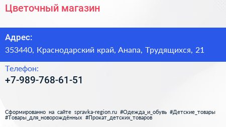 Цветочный магазин по адресу 353440, Краснодарский край, Анапа, Трудящихся, 21 в дальнейшем Организация, размещена в следующих категориях: