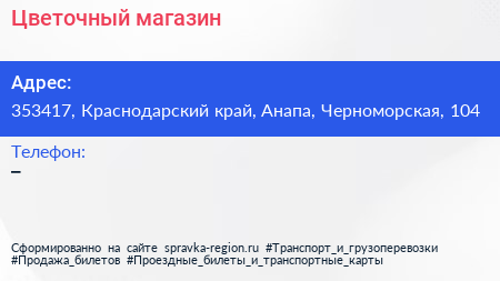 Цветочный магазин по адресу 353417, Краснодарский край, Анапа, Черноморская, 104 в дальнейшем Организация, размещена в следующих категориях: