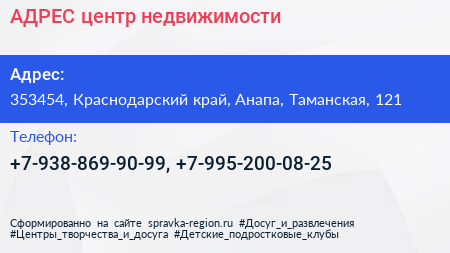 АДРЕС, центр недвижимости по адресу 353454, Краснодарский край, Анапа, Таманская, 121 в дальнейшем Организация, размещена в следующих категориях: