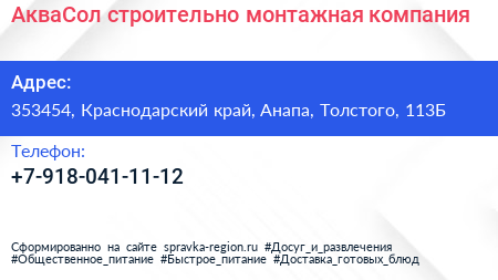 АкваСол, строительно-монтажная компания по адресу 353454, Краснодарский край, Анапа, Толстого, 113Б в дальнейшем Организация, размещена в следующих категориях: