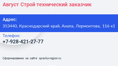 Август Строй, технический заказчик по адресу 353440, Краснодарский край, Анапа, Лермонтова, 116 к1 в дальнейшем Организация, размещена в следующих категориях: