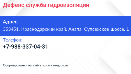 Дефенс, служба гидроизоляции по адресу 353451, Краснодарский край, Анапа, Супсехское шоссе, 1 в дальнейшем Организация, размещена в следующих категориях: