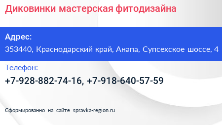Диковинки, мастерская фитодизайна по адресу 353440, Краснодарский край, Анапа, Супсехское шоссе, 4 в дальнейшем Организация, размещена в следующих категориях: