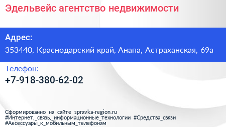 Эдельвейс, агентство недвижимости по адресу 353440, Краснодарский край, Анапа, Астраханская, 69а в дальнейшем Организация, размещена в следующих категориях:
