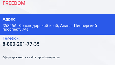 FREEDOM по адресу 353456, Краснодарский край, Анапа, Пионерский проспект, 74а в дальнейшем Организация, размещена в следующих категориях: