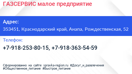 ГАЗСЕРВИС, малое предприятие по адресу 353451, Краснодарский край, Анапа, Рождественская, 52 в дальнейшем Организация, размещена в следующих категориях: