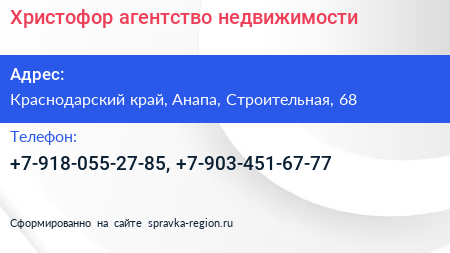 Христофор, агентство недвижимости по адресу Краснодарский край, Анапа, Строительная, 68 в дальнейшем Организация, размещена в следующих категориях: