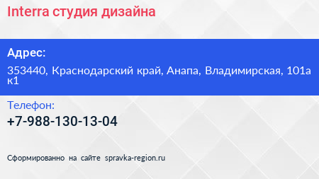 Interra, студия дизайна по адресу 353440, Краснодарский край, Анапа, Владимирская, 101а к1 в дальнейшем Организация, размещена в следующих категориях: