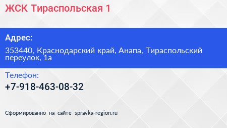 ЖСК Тираспольская 1 по адресу 353440, Краснодарский край, Анапа, Тираспольский переулок, 1а в дальнейшем Организация, размещена в следующих категориях: