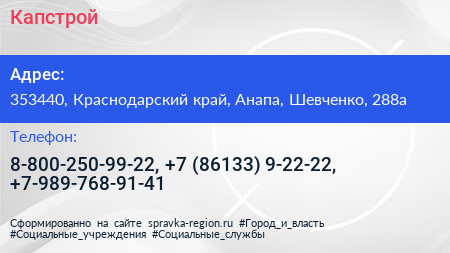Капстрой по адресу 353440, Краснодарский край, Анапа, Шевченко, 288а в дальнейшем Организация, размещена в следующих категориях: