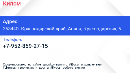 Килом по адресу 353440, Краснодарский край, Анапа, Краснодарская, 5 в дальнейшем Организация, размещена в следующих категориях: