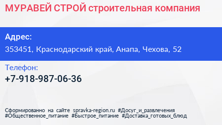 МУРАВЕЙ СТРОЙ, строительная компания по адресу 353451, Краснодарский край, Анапа, Чехова, 52 в дальнейшем Организация, размещена в следующих категориях: