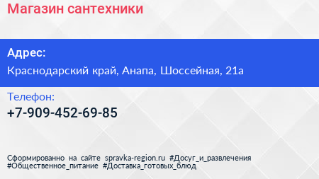 Магазин сантехники по адресу Краснодарский край, Анапа, Шоссейная, 21а в дальнейшем Организация, размещена в следующих категориях: