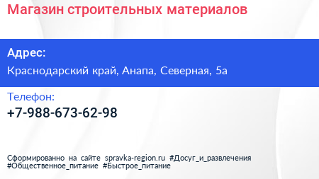 Магазин строительных материалов по адресу Краснодарский край, Анапа, Северная, 5а в дальнейшем Организация, размещена в следующих категориях:
