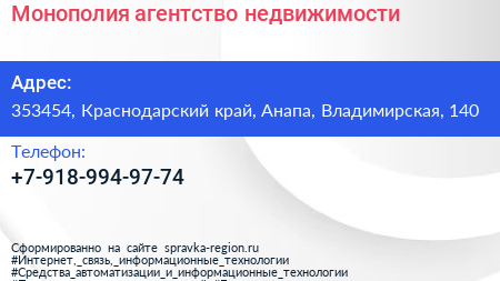 Монополия, агентство недвижимости по адресу 353454, Краснодарский край, Анапа, Владимирская, 140 в дальнейшем Организация, размещена в следующих категориях: