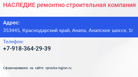 НАСЛЕДИЕ, ремонтно-строительная компания по адресу 353445, Краснодарский край, Анапа, Анапское шоссе, 1г в дальнейшем Организация, размещена в следующих категориях:
