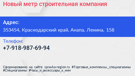 Новый метр, строительная компания по адресу 353454, Краснодарский край, Анапа, Ленина, 158 в дальнейшем Организация, размещена в следующих категориях: