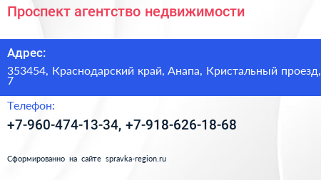 Проспект, агентство недвижимости по адресу 353454, Краснодарский край, Анапа, Кристальный проезд, 7 в дальнейшем Организация, размещена в следующих категориях: