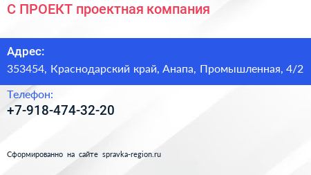 С.ПРОЕКТ, проектная компания по адресу 353454, Краснодарский край, Анапа, Промышленная, 4/2 в дальнейшем Организация, размещена в следующих категориях: