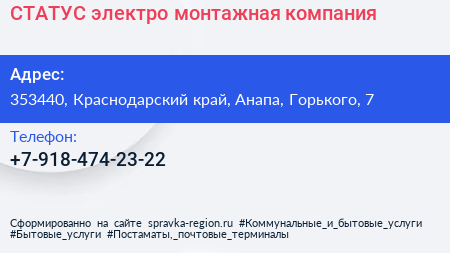 СТАТУС, электро-монтажная компания по адресу 353440, Краснодарский край, Анапа, Горького, 7 в дальнейшем Организация, размещена в следующих категориях: