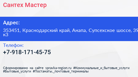 Сантех Мастер по адресу 353451, Краснодарский край, Анапа, Супсехское шоссе, 39 к3 в дальнейшем Организация, размещена в следующих категориях: