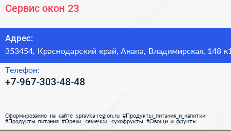 Сервис окон 23 по адресу 353454, Краснодарский край, Анапа, Владимирская, 148 к1 в дальнейшем Организация, размещена в следующих категориях: