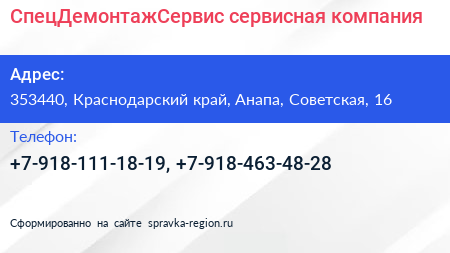 СпецДемонтажСервис, сервисная компания по адресу 353440, Краснодарский край, Анапа, Советская, 16 в дальнейшем Организация, размещена в следующих категориях: