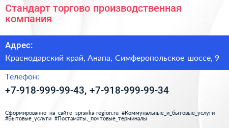 Стандарт, торгово-производственная компания по адресу Краснодарский край, Анапа, Симферопольское шоссе, 9 в дальнейшем Организация, размещена в следующих категориях: