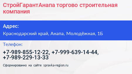 СтройГарантАнапа, торгово-строительная компания по адресу Краснодарский край, Анапа, Молодёжная, 1Б в дальнейшем Организация, размещена в следующих категориях: