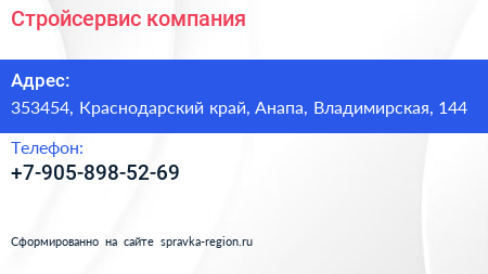Стройсервис, компания по адресу 353454, Краснодарский край, Анапа, Владимирская, 144 в дальнейшем Организация, размещена в следующих категориях: