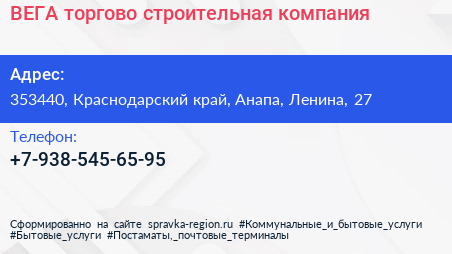 ВЕГА, торгово-строительная компания по адресу 353440, Краснодарский край, Анапа, Ленина, 27 в дальнейшем Организация, размещена в следующих категориях: