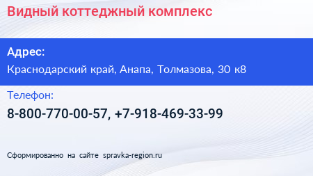 Видный, коттеджный комплекс по адресу Краснодарский край, Анапа, Толмазова, 30 к8 в дальнейшем Организация, размещена в следующих категориях: