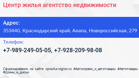 Центр жилья, агентство недвижимости по адресу 353440, Краснодарский край, Анапа, Новороссийская, 279 в дальнейшем Организация, размещена в следующих категориях: