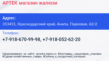 АРТЕК, магазин жалюзи по адресу 353451, Краснодарский край, Анапа, Парковая, 62/2 в дальнейшем Организация, размещена в следующих категориях: