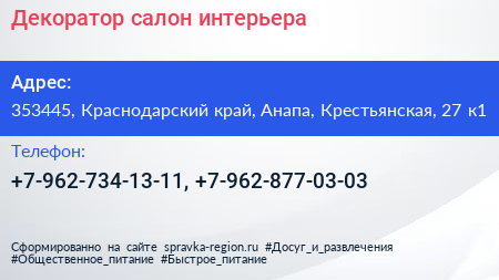Декоратор, салон интерьера по адресу 353445, Краснодарский край, Анапа, Крестьянская, 27 к1 в дальнейшем Организация, размещена в следующих категориях: