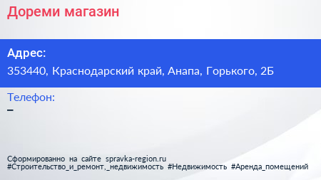 Дореми, магазин по адресу 353440, Краснодарский край, Анапа, Горького, 2Б в дальнейшем Организация, размещена в следующих категориях: