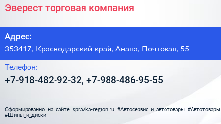 Эверест, торговая компания по адресу 353417, Краснодарский край, Анапа, Почтовая, 55 в дальнейшем Организация, размещена в следующих категориях: