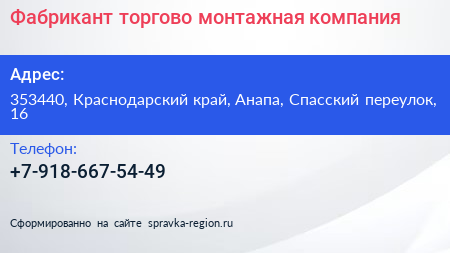 Фабрикант, торгово-монтажная компания по адресу 353440, Краснодарский край, Анапа, Спасский переулок, 16 в дальнейшем Организация, размещена в следующих категориях: