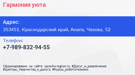 Гармония уюта по адресу 353451, Краснодарский край, Анапа, Чехова, 52 в дальнейшем Организация, размещена в следующих категориях: