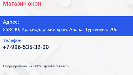 Магазин окон по адресу 353440, Краснодарский край, Анапа, Тургенева, 206 в дальнейшем Организация, размещена в следующих категориях: