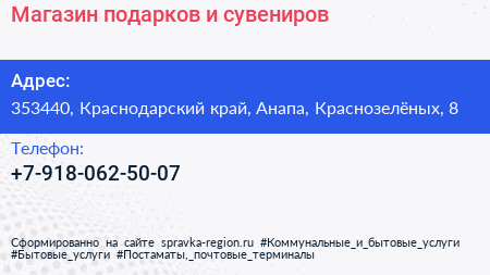 Магазин подарков и сувениров по адресу 353440, Краснодарский край, Анапа, Краснозелёных, 8 в дальнейшем Организация, размещена в следующих категориях: